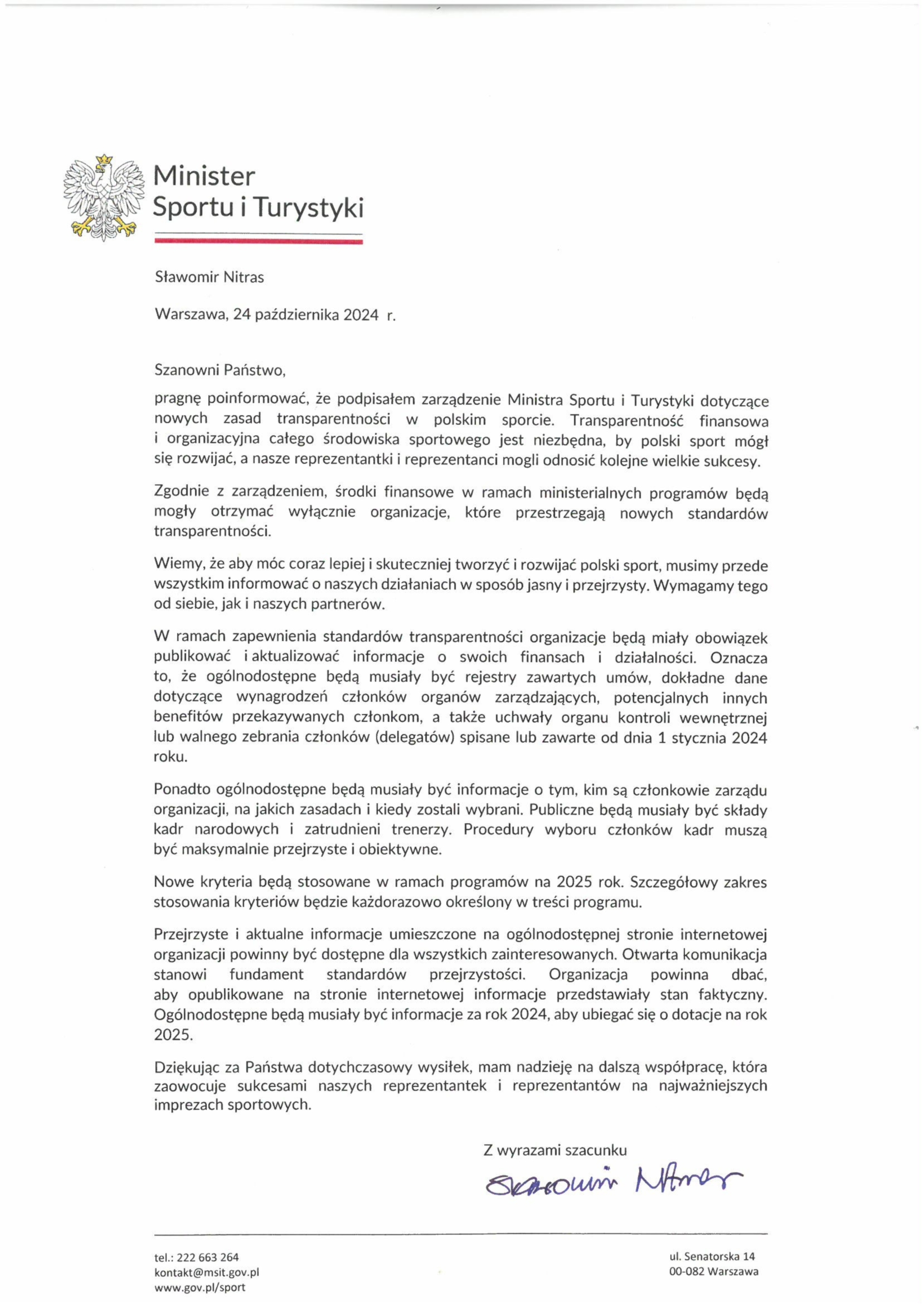 Pismo Ministra Sportu i Turystyki
