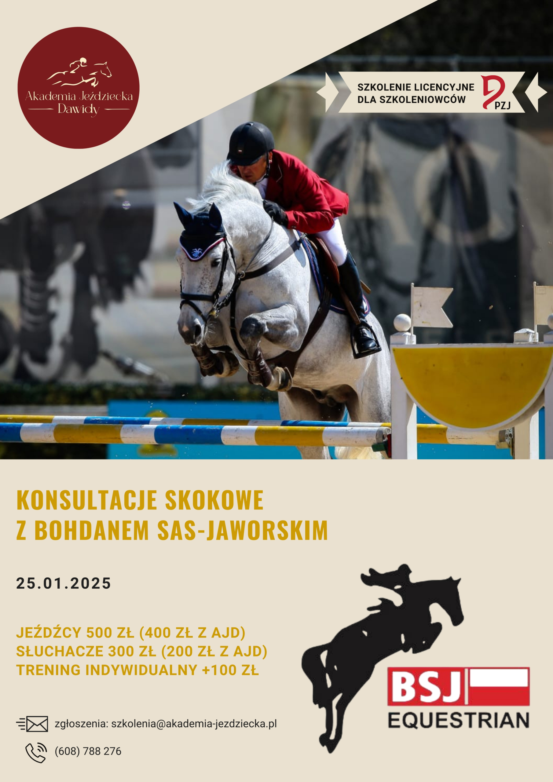 Zapraszamy na konsultacje skokowe o statusie szkolenia licencyjnego PZJ dla szkoleniowców. z Bohdanem Sas-Jaworskim, które odbędą się w Akademii Jeździeckiej Dawidy 25 stycznia 2025 roku.