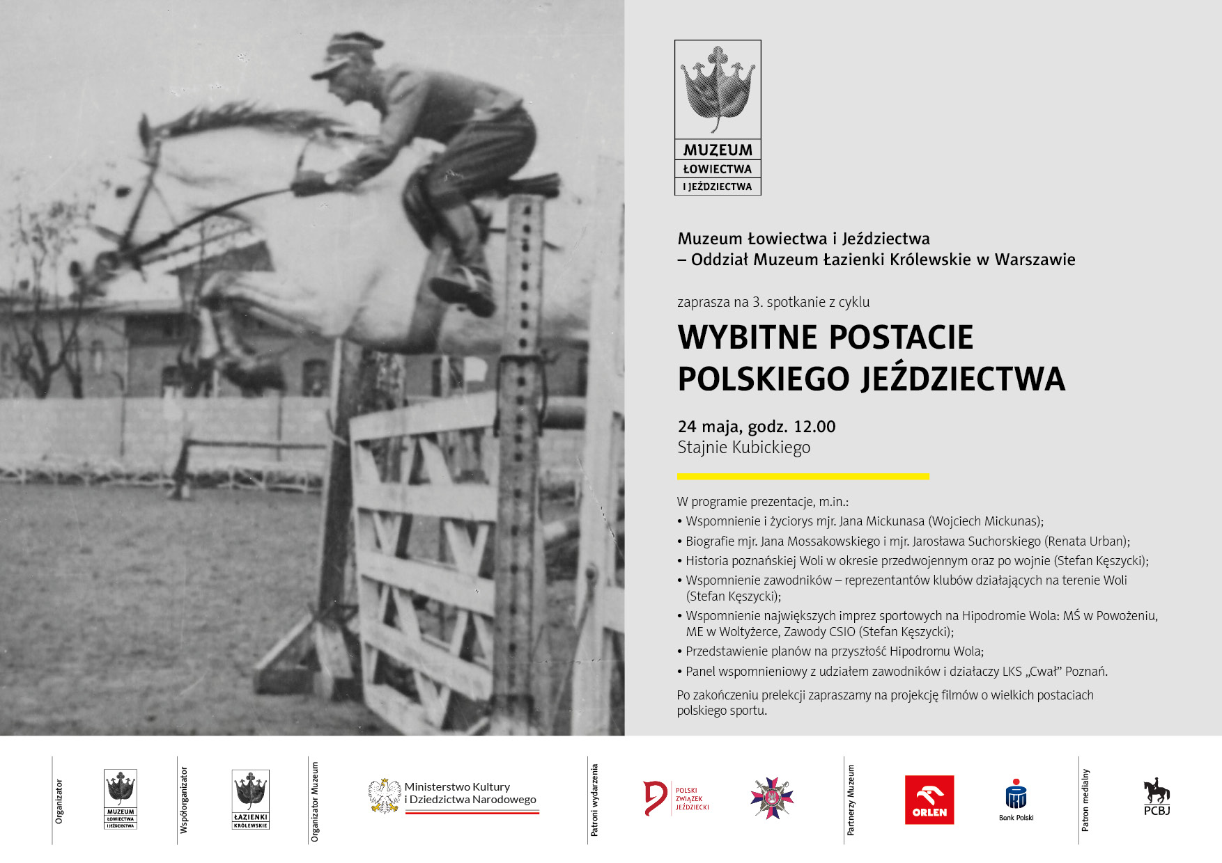 W imieniu organizatorów zapraszamy na kolejne, już trzecie spotkanie w Łazienkach Królewskich z cyklu „Wybitne postacie polskiego jeździectwa”. Wydarzenie odbędzie się 24 maja 2025 (sobota) w Stajniach Kubickiego o godzinie 12.00. W programie spotkania: