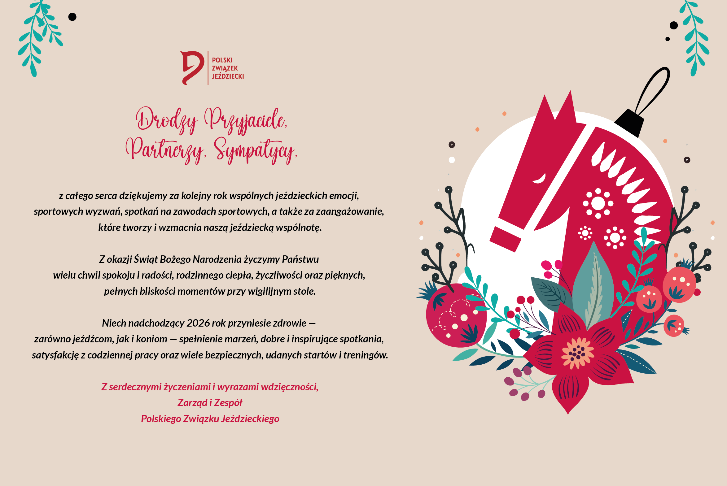 Z serdecznymi życzeniami i wyrazami wdzięczności, Zarząd i Zespół Polskiego Związku Jeździeckiego.